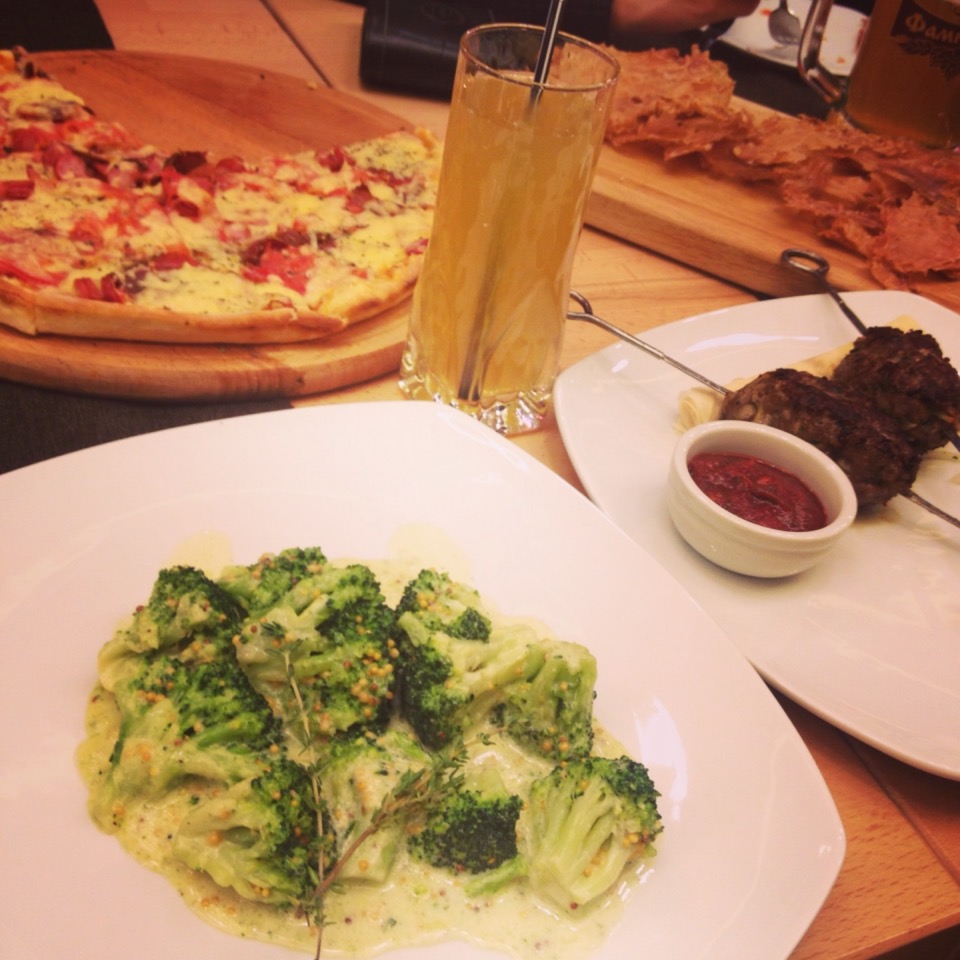 Хорошее обслуживание, вкусная еда (брокколи в сливочно-горчичном соусе, пицца, салат Цезарь, мясные чипсы, пиво) все понравилось. Я в восторге он НАСТОЯЩЕГО домашнего яблочного сока! Интерьер шикарен.